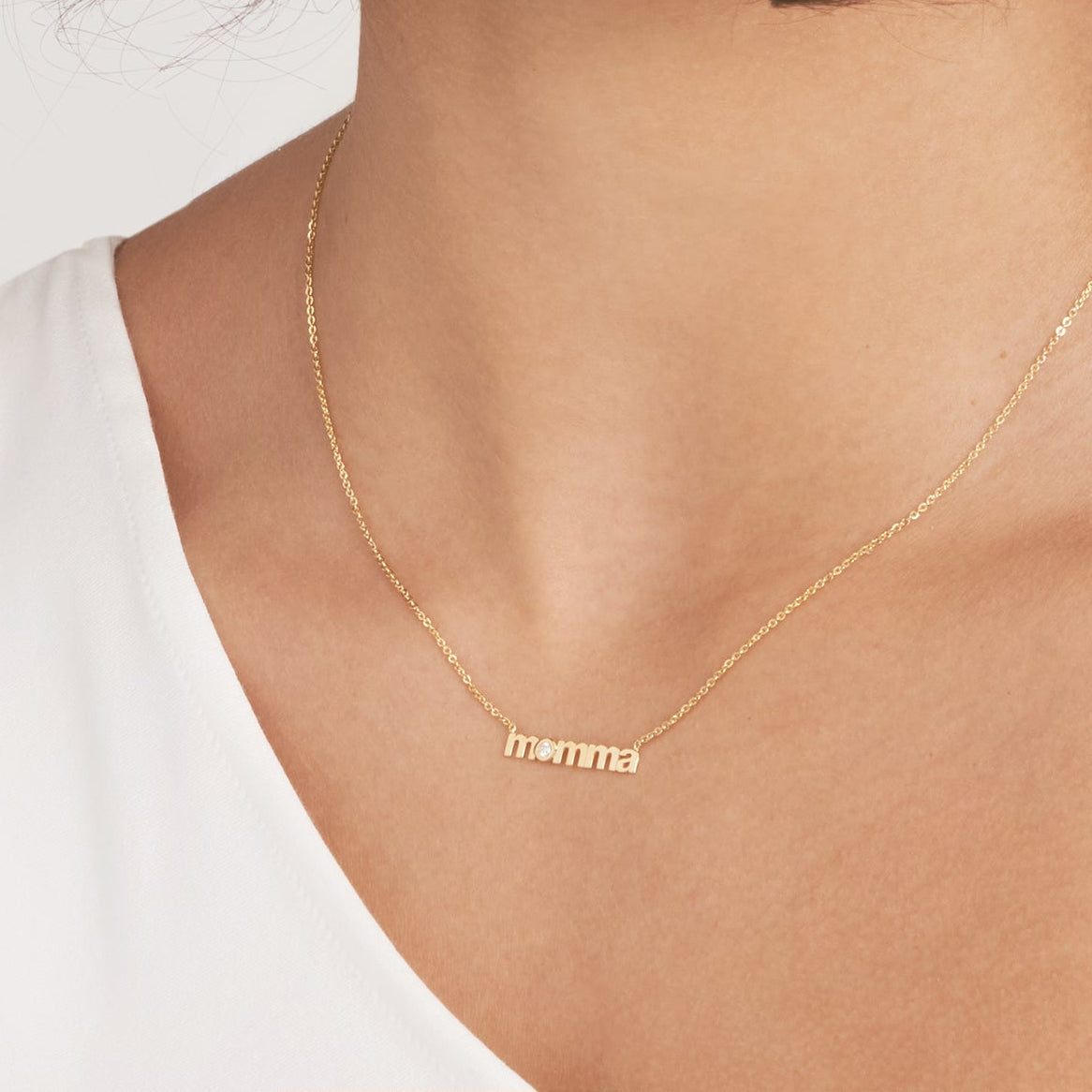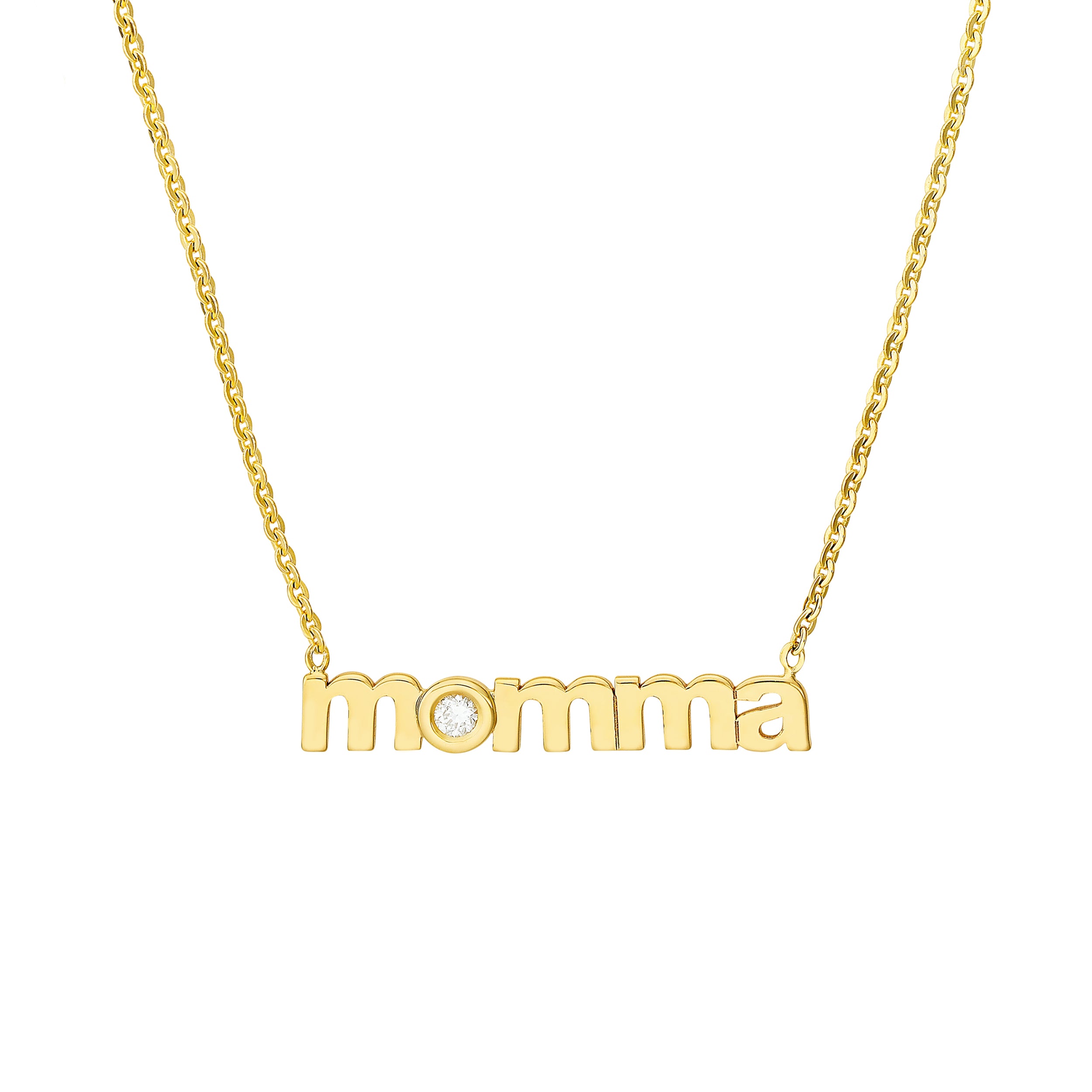 Introduce a piece that speaks straight to the heart — the momma necklace, hand-crafted in warm 14K yellow gold with the word momma written in delicate lowercase script. Nestled in the curve of the "o" is a sparkling 3-point diamond, adding just the right touch of brilliance to this deeply personal piece.