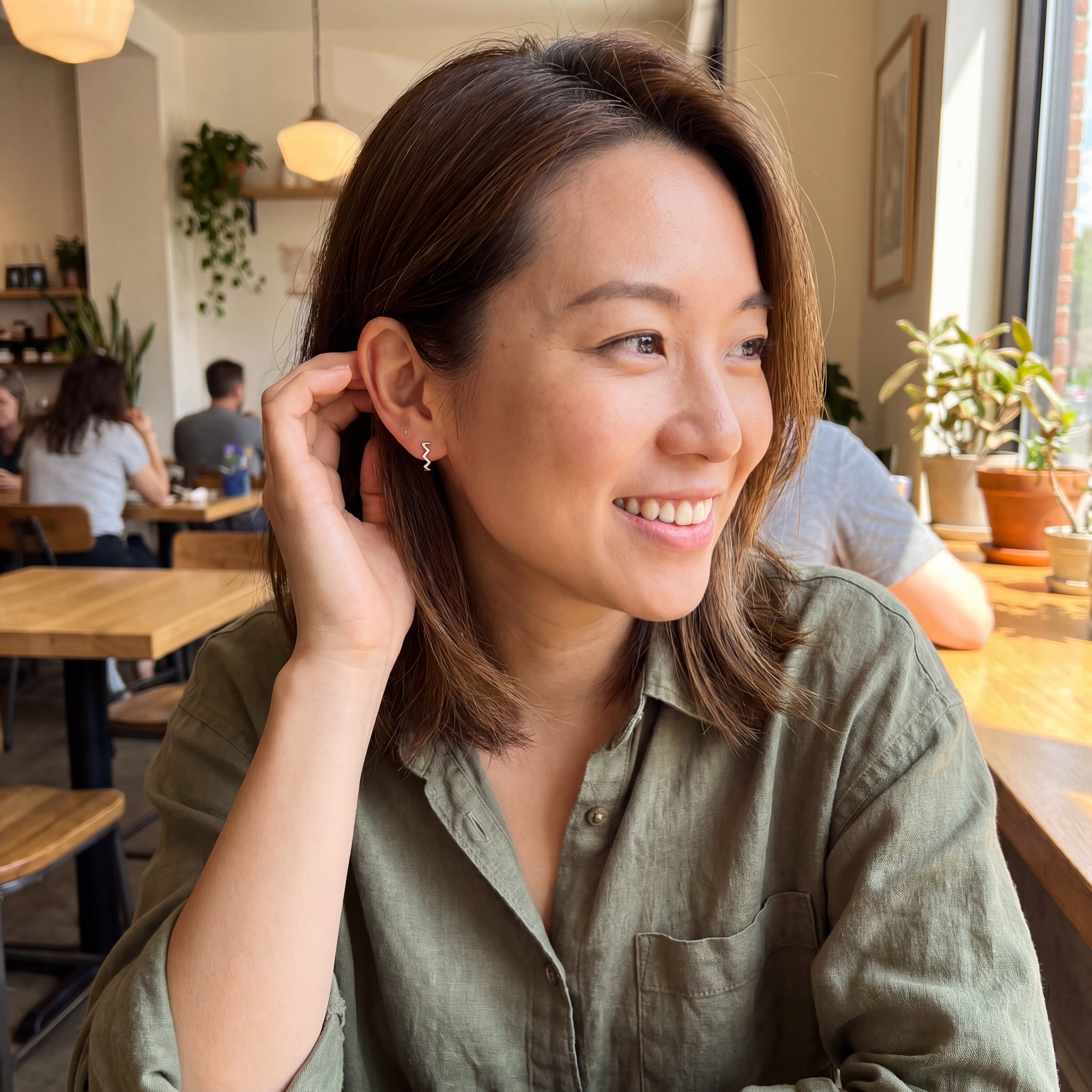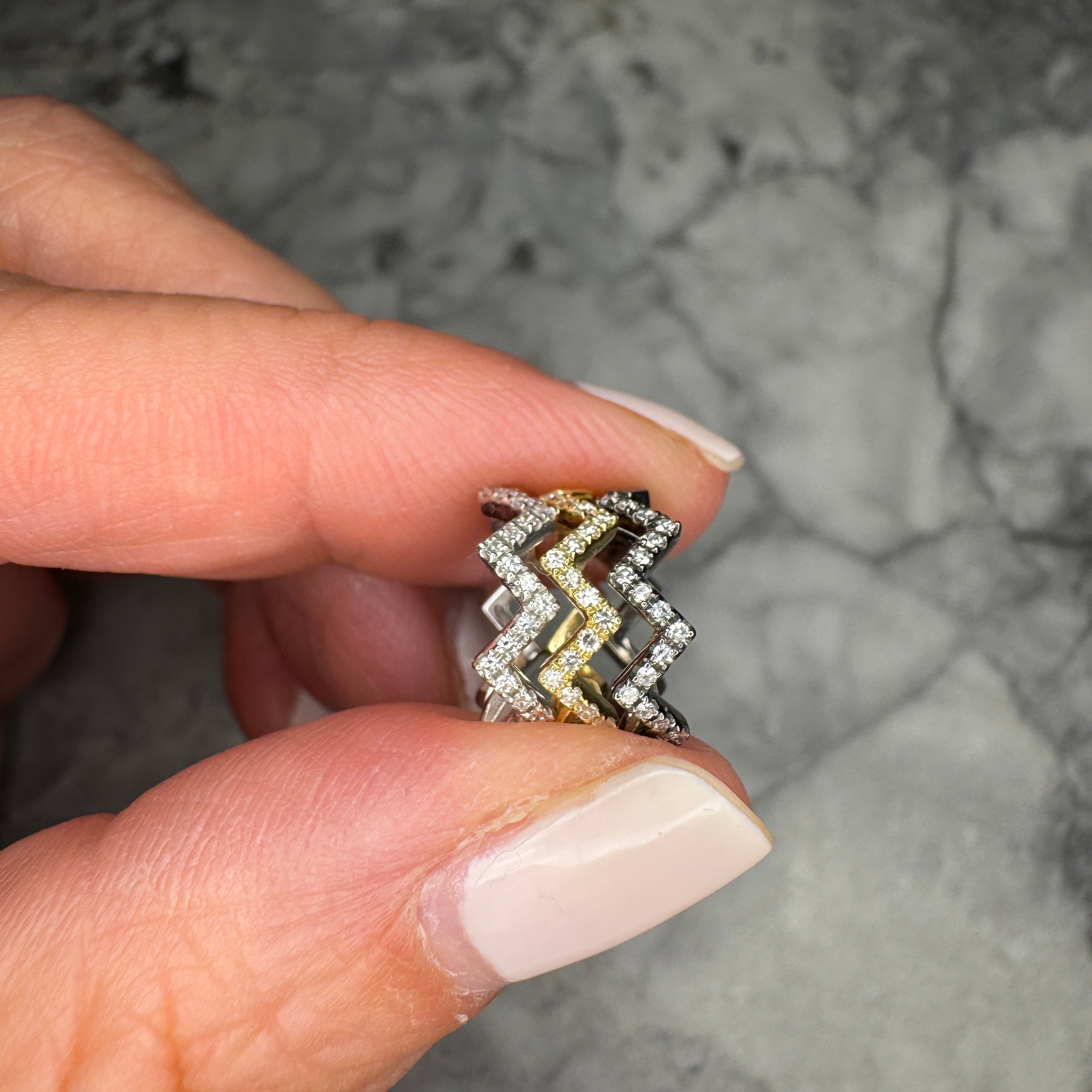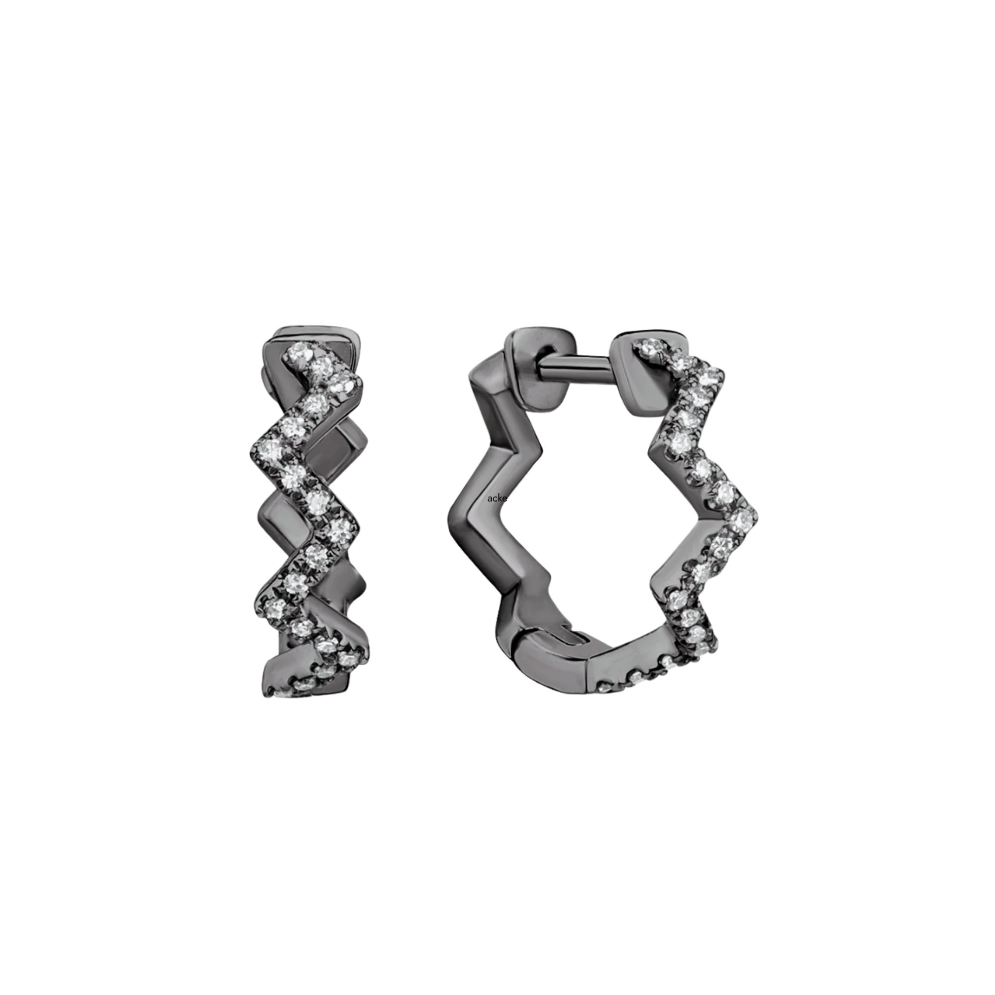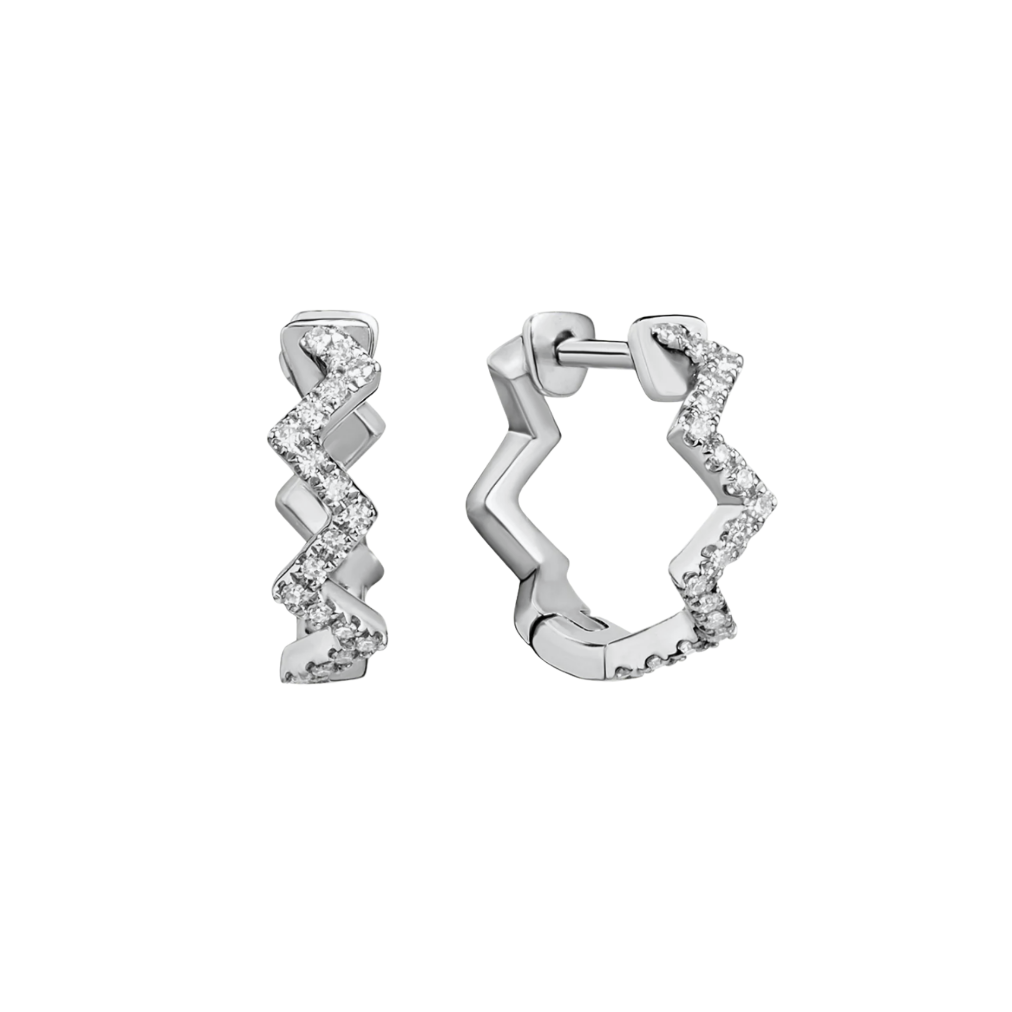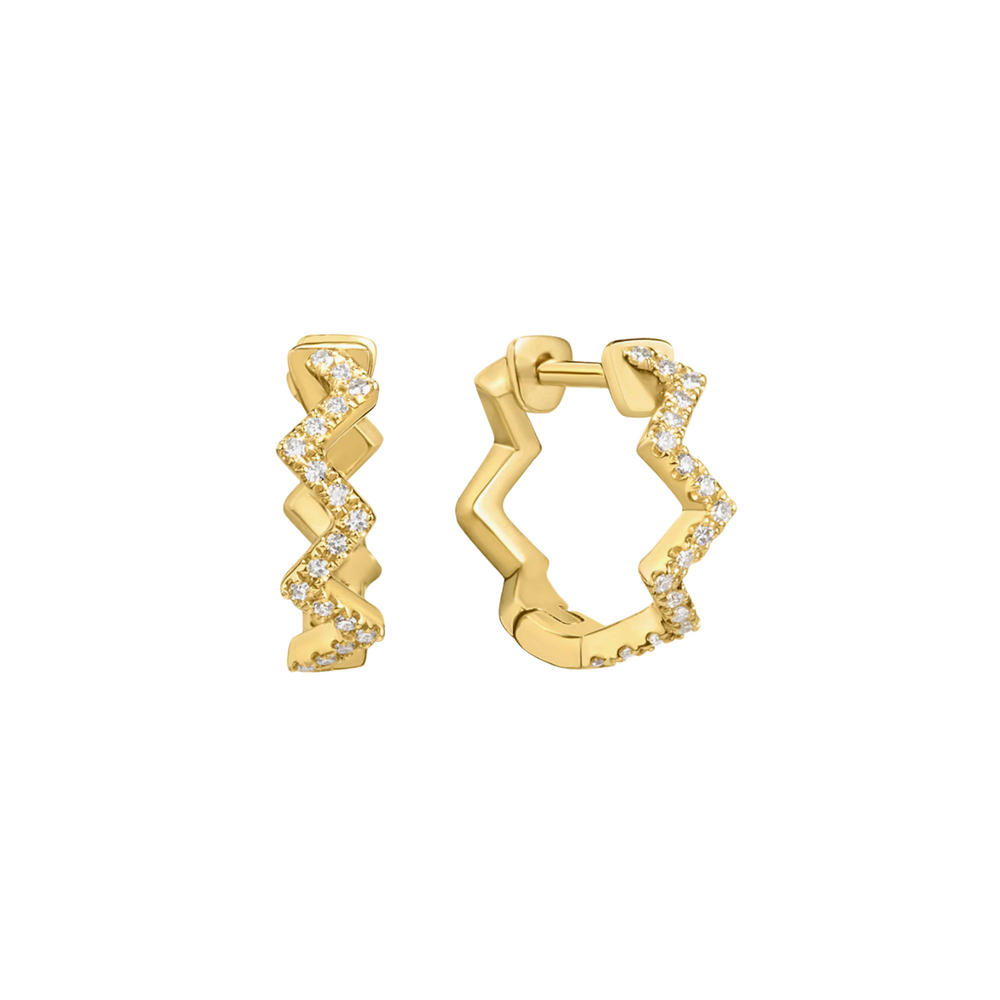 Designed to "hug" your earlobe, our Stacker Huggies give you the elegance of bright diamonds shining in the light in an everyday style. These small hoops effortlessly transition from day as a casual go-to into evening as a statement. The pair are pavé set with ~0.12 ctw of natural diamonds in 14k gold in a zig zag fashion. The hoop measures 12mm in diameter and has a hinge to clasp shut.